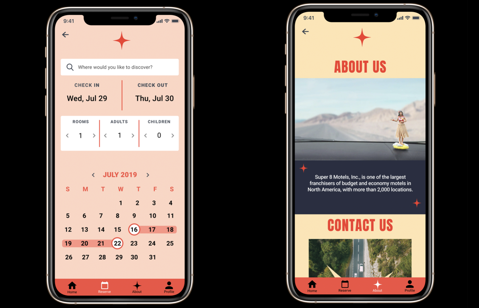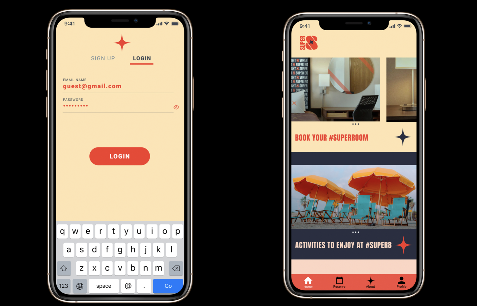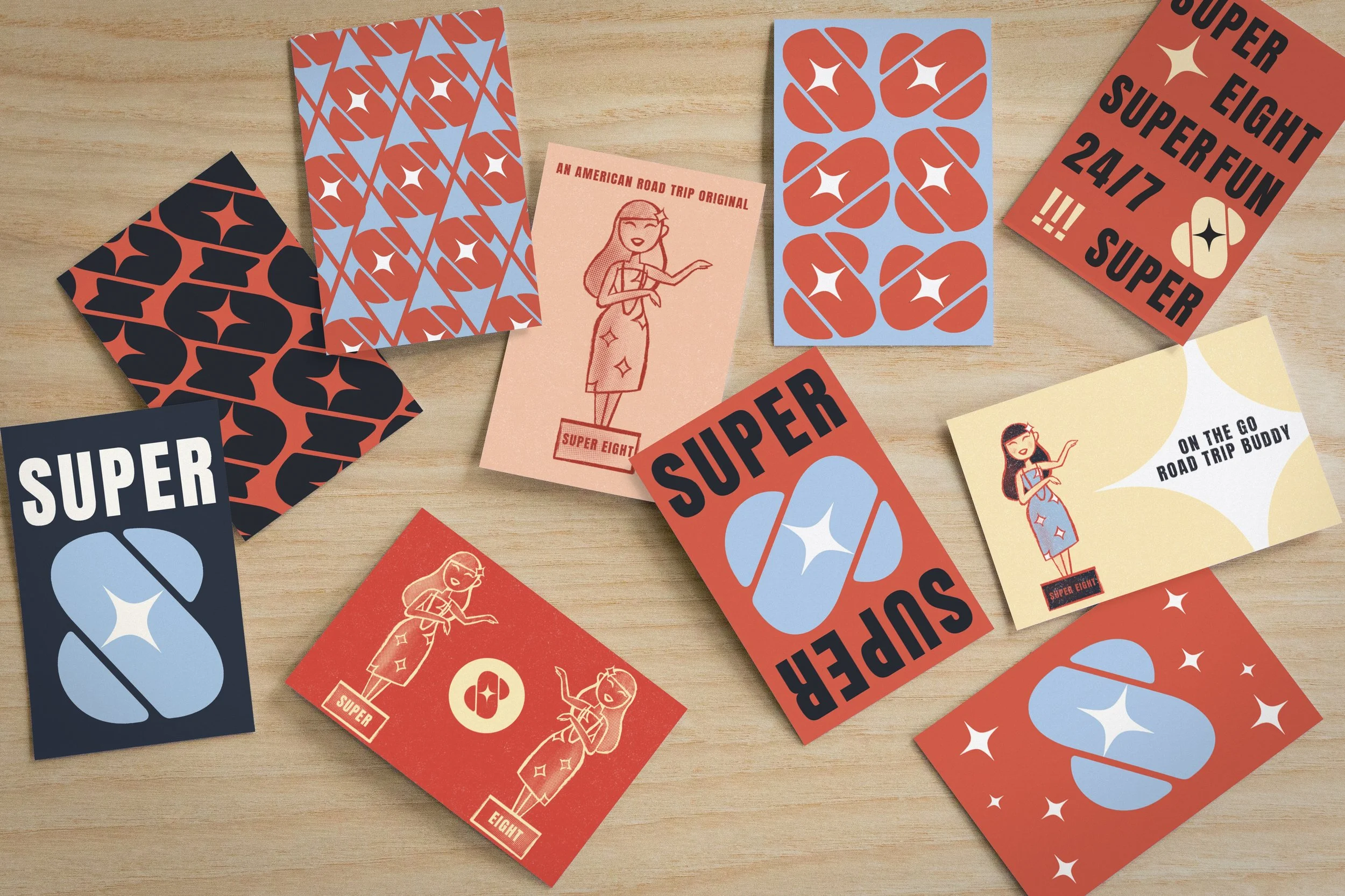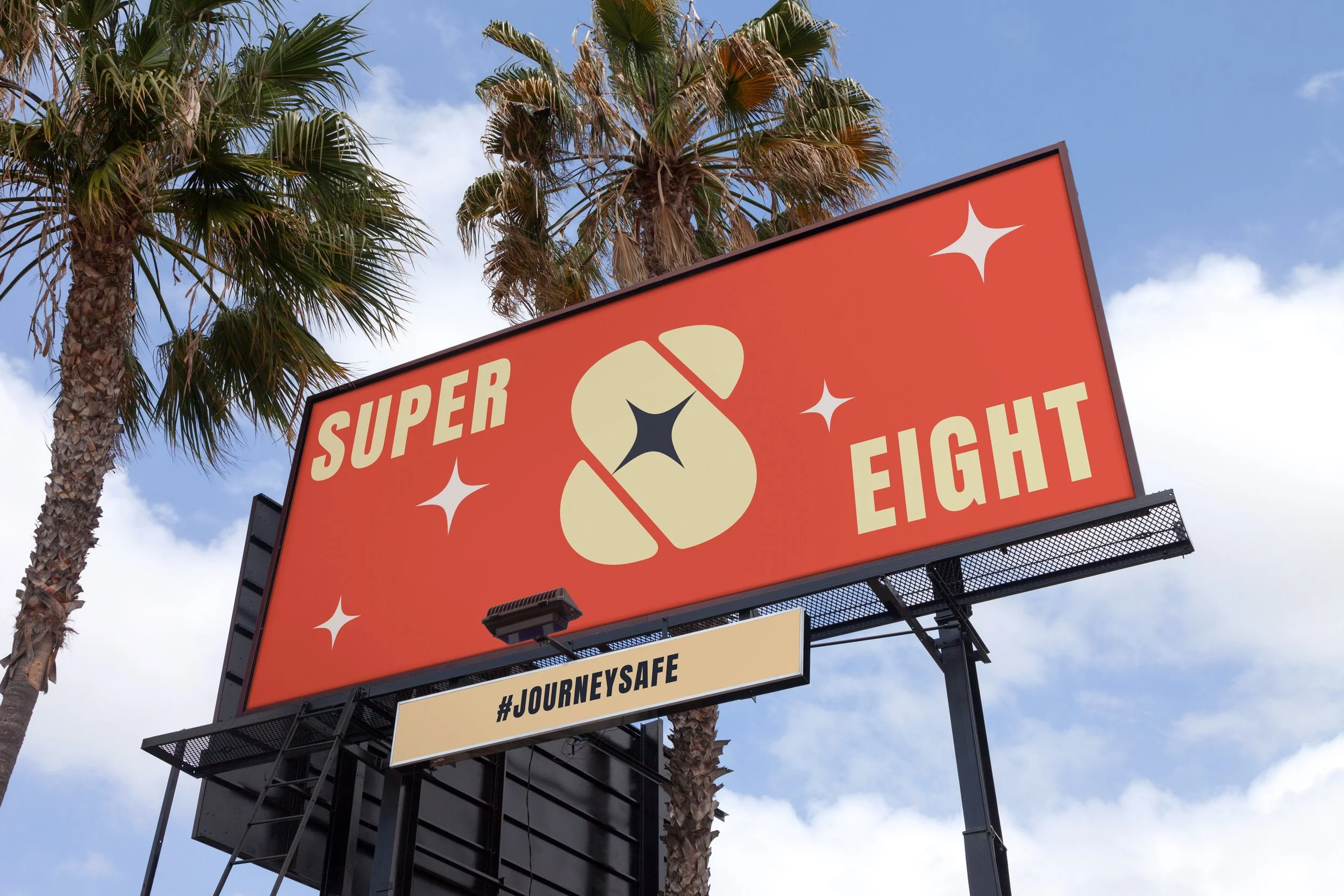 The Logo was created from the idea of the hotel being a pit-stop. The star represents the connection between highways in which a Super 8 would be located near. The combination of intersecting S & 8 pays homage to the nostalgic quote of the hotel, “A Road Trip Original”.